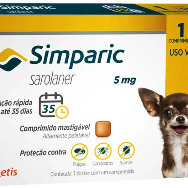O Antipulgas Zoetis Simparic 5 mg para Cães 1,3 a 2,5 kg é utilizado para o tratamento das infestações por pulgas e sarna sarcótica. Após a administração do Simparic, a sua atividade contra pulgas dura, pelo menos, 5 semanas. O medicamento também pode ser utilizado como parte de uma estratégia de tratamento para o controle da dermatite alérgica por picada de pulga (uma reação alérgica às picadas de pulga). Contém a substância ativa sarolaner.