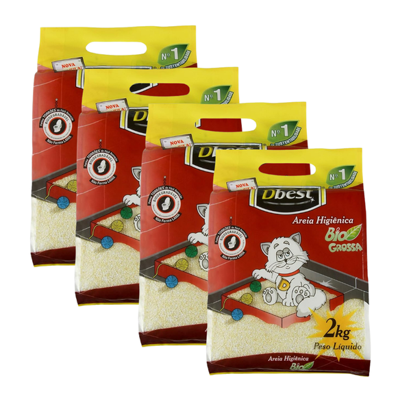 A AREIA HIGIÊNICA DBEST BIO GROSSA é um produto granulado biodegradável, isento de poeira e destinado a servir de cama na bandeja sanitária dos gatos e que serve para a absorção da urina e de suas fezes, forma torrões firmes e flexíveis o que facilita sua retirada e atribui praticidade na limpeza da bandeja sanitária. Possui grande capacidade na absorção dos odores e da umidade. O produto é seguro para os animais já que sua composição é 100% natural, feita com materiais orgânicos renováveis e biodegradáveis a partir da mandioca e do milho e sem agregação de quaisquer produtos químicos ( corantes, bactericidas, agregadores, desodorantes ou fragrâncias). O granulado apresenta coloração clara com uma granulometria mais grossa e com grãos arredondados e suaves para as patas dos animais, especialmente formulada para gatos de pelagem longa e/ou crespa características estas que favorecem que os grãos sejam carregados em sua pelagem e patas para fora da bandeja sanitária, esta granulometria mais grossa evita que o granulado se espalhe pelo ambiente. Porém dada sua característica, esta areia não deve ser utilizada para animais de porte grande ou que apresentem grande volume de urina. O granulado possui grande capacidade de absorção, contribuindo para a eliminação dos odores, mantendo o fundo da bandeja sempre seco, mesmo no momento de troca da areia. Trata-se de um produto ecologicamente correto já que, quando descartado, é bio-degradável, podendo ser descartado diretamente no vaso sanitário e não agride o meio ambiente. A sua cor clara possibilita ao criador observar alterações na coloração da urina do seu animal, o que por sua vez pode indicar eventuais problemas urinários, caso os torrões apresentem variação na coloração habitual leve seu animal ao veterinário.