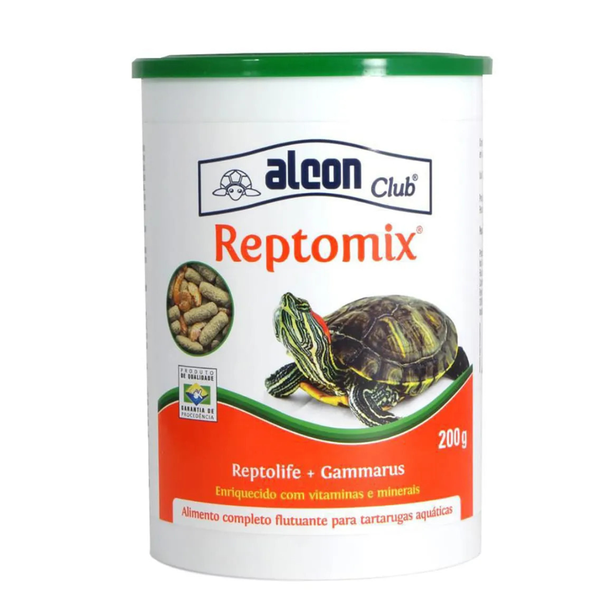 A Ração Alcon Reptomix é um alimento completo para tartarugas aquáticas, formado pelo alimento Alcon Club ReptoLife com o crustáceo desidratado Gammarus sp. É uma dieta balanceada, representada pelo alimento extrusado e pelo alimento natural Gammarus, muito nutritivo e adorado pelas tartarugas aquáticas. Enriquecido com vitaminas e minerais, proporciona desenvolvimento e grande vitalidade a estes répteis. Sem corantes artificiais.