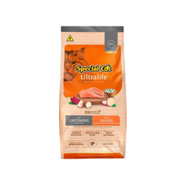 A Ração Seca Special Cat Ultralife Salmão e Arroz para Gatos Castrados 10+ é um alimento completo elaborado para os gatinhos na fase sênior, visando suprir a necessidade fisiológica deles. Possui beta glucanos e proteínas funcionais, eles atuam na estimulação do sistema imunológico, desta forma melhorando a saúde dos felinos com mais de 10 anos de idade. Ajuda na redução de bolas de pelos e favorece o trânsito intestinal, devido ao blend de fibras especiais que fazem parte da composição. Contém zinco, ômegas 3 e 6, responsáveis por proporcionar proteção da pele e redução da queda de pelos, assim seu amiguinho terá uma refeição balanceada que proporcionará bem-estar e uma pelagem mais brilhante e bonita.