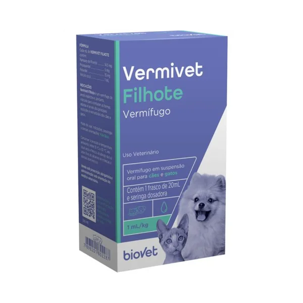 O Vermífugo Biovet Vermivet Filhotes para Cães e Gatos é um produto composto de Pamoato de Pirantel, Praziquantel e Febantel que garantem largo espectro contra formas adultas e larvais dos principais cestoides e nematoides dos cães e gatos, com grande margem de segurança, já que a dose tóxica é extremamente superior à recomendada.
